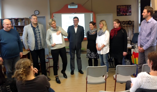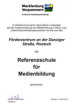 Seit dem 06.11.2015 darf sich unsere Schule "Referenzschule für Medienbildung" nennen. Gäste unserer Lehrekonferenz am 06. November waren Dr. Jan Hartmann (Leiter des Medienpädagogischen Zentrums im IQMV, Ministerium für Bildung, Wissenschaft und Kultur) und Steffen Look (Medienpädagogischer Berater im Schulamt Rostock). Nachdem Dr. Hartmann uns noch mal alle unsere Meilensteine im Schulversuch "Auf dem Weg zur Medienschule" bewusst gemacht hat, nahm unsere Schulleiterin Frau Moscha die Urkunde mit dem Titel "Referenzschule für Medienbildung" in Empfang. Mit einer kleinen Feierstunde ließen wir unsere ganz besondere Lehrerkonferenz ausklingen. So kamen alle Lehrerinnen und Lehrer sowie unsere Gäste noch einmal ins Gespräch. |
